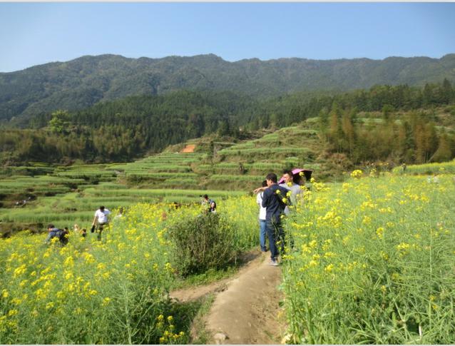第二天上午我們乘車來到江西婺源江嶺,婺源歸來不看村,江嶺歸來不看花。江嶺,是國內(nèi)四大油菜花海之一,江嶺自然是婺源觀賞油菜花的首選之地。萬畝油菜花海在漫山遍野的梯田間肆意綻放。漫步于高低蜿蜒的觀景棧道,如同來到一片花的海洋。黃燦燦的花陣隨風搖擺,就像一層層翻涌的波浪。在綿延起伏金黃花海之中,形成清新淳美的鄉(xiāng)村田園風光,一派生趣盎然。